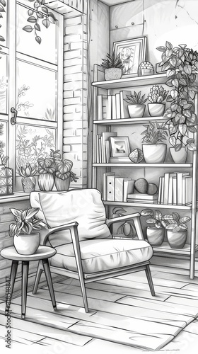 minimalist, living room, interior design, botanical, decor, illustration, plant, potted plants, bookshelf, rug, modern, contemporary, stylish, home decor, bohemian, green, foliage, elegant, simple, neutral, organic, shelf, furniture, art, drawing, vignetting, clean, white background, cosy, inviting, scandinavian, hand-drawn, graphic, detailed, trendy, relaxing, home, comfortable, living space, serene, aesthetic, houseplant