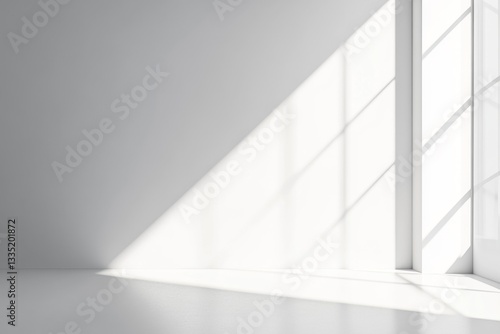 Minimalist, bright, empty room with large window. Sunlight casts shadows on white walls and floor