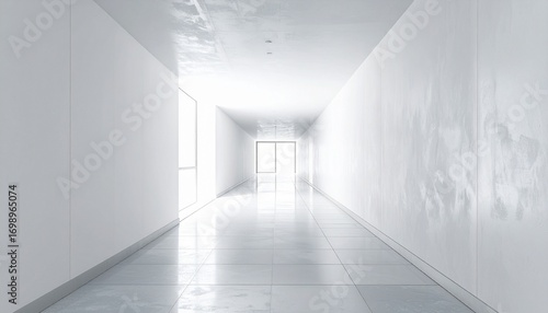 white, corridor, hallway, minimalist, modern, architecture, interior design, empty, bright, light, clean, sterile, reflective, tiled floor, long, narrow, perspective, vanishing point, abstract, futuristic, background, copy space, blank, simplicity, sleek, roomy, geometric, symmetry, pathway, journey, future, innovation, technology, corporate, commercial, medicals, hospital, office, gallery, exhibition, cleanliness, serene, calm, tranquil, openness, digital artwork, rendering