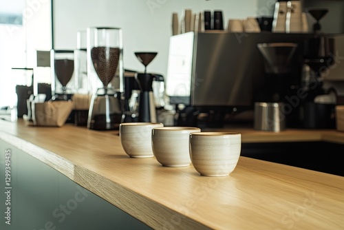 Minimalist café scene featuring elegant cups lined on wooden cou