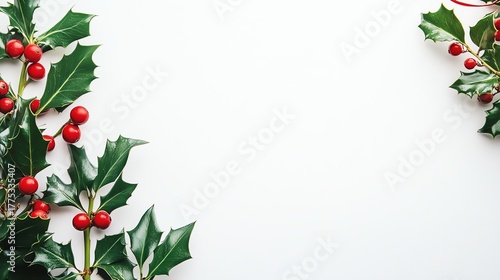 christmas, holly, berry, red, green, white, background, minimalist, festive, holiday, winter, season, decoration, nature, plant, tree branch, leaf, copy space, border, frame, simple, clean, design, greeting card, invitation, banner, poster, template, celebration, december, traditional, christmas, seasonal, topview, photo, image, still life, natural, christmas background, white background