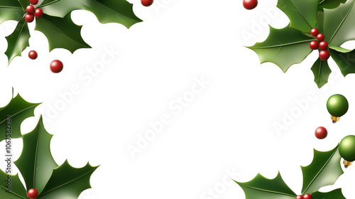 Minimalist Christmas Holly Frame, Vibrant Green Leaves and Berries around Edges on a White Background