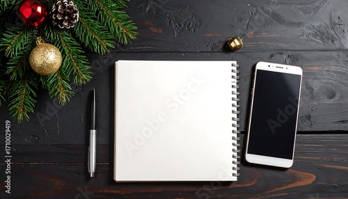 christmas, winter, holiday, notepad, phone, ornament, decoration, workspace, minimal, modern, design, inspiration, journal, gift, writing, technology, celebration, table, wooden, decor, accessory, empty