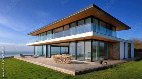 Minimalist coastal house with spacious balconies, expansive sea views, and glass walls