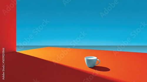 Minimalist Color Block Composition: White Coffee Cup on Vibrant Orange Surface Against Blue Background