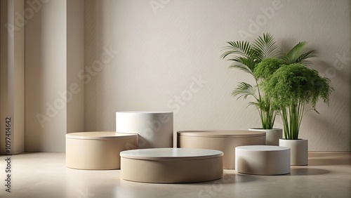 Minimalist display podiums in neutral tones for showcasing products , minimal, podium, display, products, neutral, tones