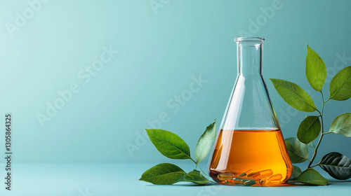 minimalist drug concept featuring glass flask with orange liquid and green leaves
