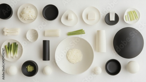 minimalist, food, arrangement, white, black, plate, bowl, rice, vegetable, design, modern, contemporary, shape, geometric, styling, still life, food photography, presentation, display, ingredient, fresh, healthy, healthy eating, diet, cookery, asian, japanese, texture, ceramic, simple, clean, aesthetic, studio, lighting, composition, art, visual, creative, detail, abstract, photo