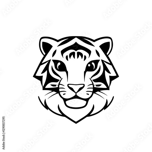 Minimalist graphic of a tiger's face, black and white, with a stylized design, centered, on white background.
