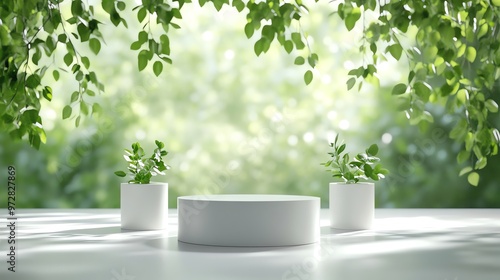 Minimalist green plant and white podium on a blurred natural background, suitable for product display and presentation.