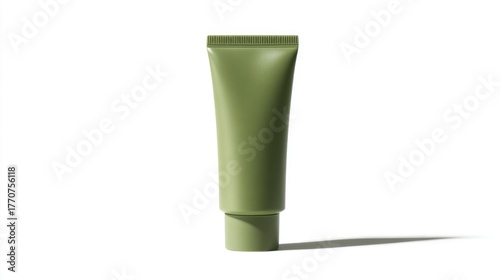 Minimalist green skincare tube on white background, space for text