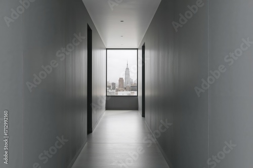 Minimalist hallway with grey walls and a window offering a view beyond the interior space.