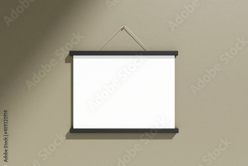 Minimalist hanging horizontal black poster canvas or photo frame mockup in living room. 3D rendering.