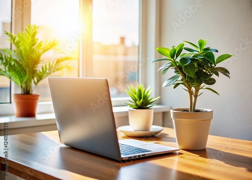 Minimalist Home Office Desk Setup: Laptop & Plant, Work From Home Concept