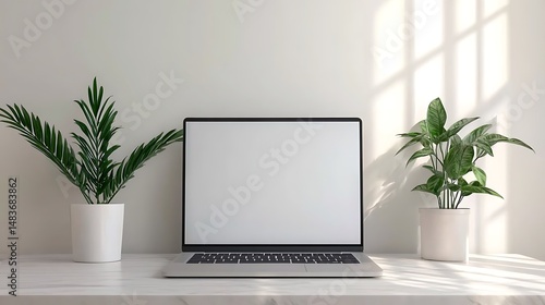 Minimalist Home Office Setup: Open Laptop with Blank Screen and Potted Green Plants on Bright Desk.