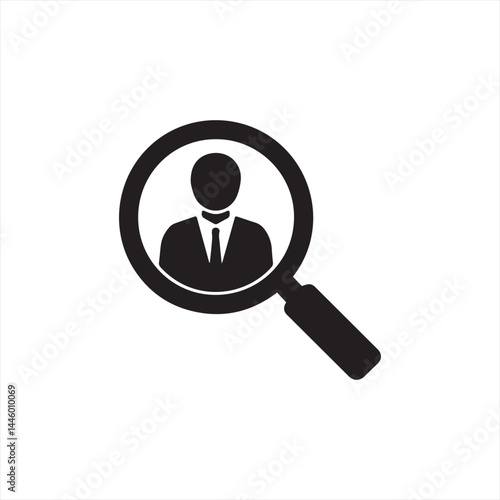 minimalist icon of a person inside a magnifying glass. The person is a black silhouette with no facial features, wearing a suit and tie. The magnifying glass is black with a white handle.