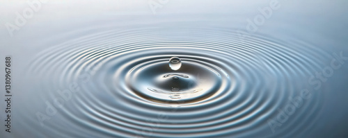 minimalist image of single water droplet colliding with surface, creating ripples in calm water