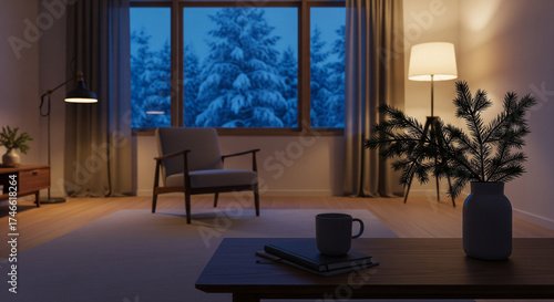 living room, interior, room, night, winter, armchair, chair, coffee table, table, mug, book, scenery, snow, tree, window, cosy, minimalist, home, house, apartment, residence, dwelling, furniture, design, contemporary, modern, style, quiet, calm, evening, dusk, indoor, scene, domestic, domestic life, lamp, curtain, floor, plant, vase, decoration, nobody, indoor, inside, stillness, background, residential, simple