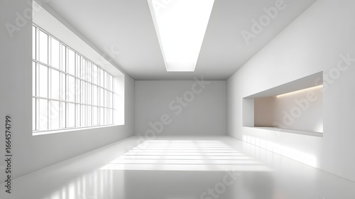Minimalist Interior Space with Bright White Light and Geometric Patterns from Windows