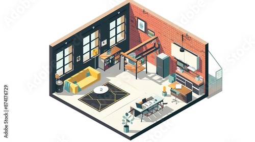 Minimalist, Isometric illustration of an industrial loft with urban styling and raw materials, symbolizing industrial interiors and edgy design, with copy space for text