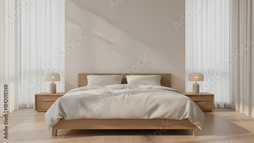 Minimalist Japandi Bedroom Mockup with Empty Wall, Natural Wood, and Serene Shadow Play. Interior Design Background