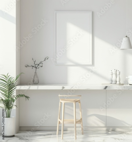 Minimalist kitchen counter with a wooden stool. a potted plant. and a blank frame