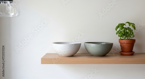 Minimalist Kitchen Still Life with Bowls and Potted Basil on Wooden Shelf