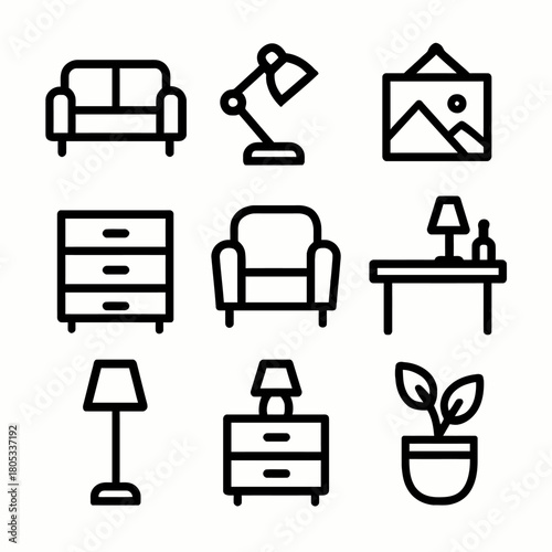 Minimalist line art icons of home furniture and decor elements