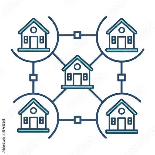 Minimalist Line Art Illustration of Networked Houses Connected by Digital Nodes Symbolizing Smart Neighborhood