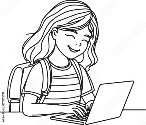 Minimalist Line Drawing of Girl Using Laptop for Online Learning