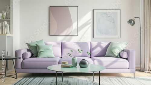 Minimalist living room with lavender sofa, mint green cushions, sleek coffee table, abstract art, and natural light.