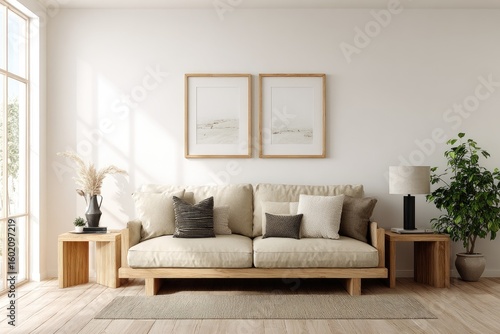 minimalist, living, room, light, wood, sofa, beige, cushion, artwork, framed, plant, natural, sunlight, simple, modern, cosy, clean, empty, empty space, warm, natural light, flooring, rug, wooden, decor, potted, interior, design, scandinavian, japanese, calm, bright, roomy, contemporary, neutral, rustic, earthy, warm tones, texture, sharpened, home, relaxing, aesthetic, functional