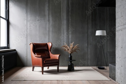 Minimalist Loft Design with Bold Leather Armchair and Dark Cement Wall