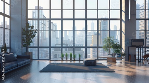 minimalist loft with floor-to-ceiling energy-efficient windows, offering an urban panorama while maintaining a quiet, insulated interior