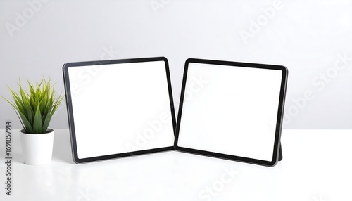 Minimalist Mockup: Two Blank Tablets & Potted Plant on White Surface