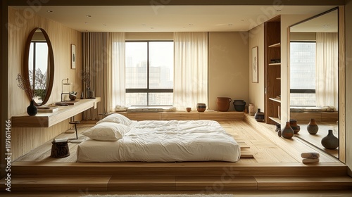 minimalist, modern, bedchamber, wooden, light, interior, design, decor, natural, cosy, serene, bed, elegance, simplicity, architecture, window, urban, city landscape, neutral, aesthetic, atmosphere, luxury, scandinavian, peaceful, mirror, furniture, clean, stylish, contemporary, calmness, warmth, relaxation, harmony, soft, refined, texture, plant, pottery, shelf, layout, bedding, fresh, inviting, balance, palette, craftsmanship
