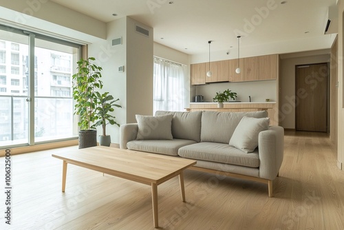 Minimalist, Modern living room interiors with light gray sofas based on Scandinavian interiors. Generative AI
