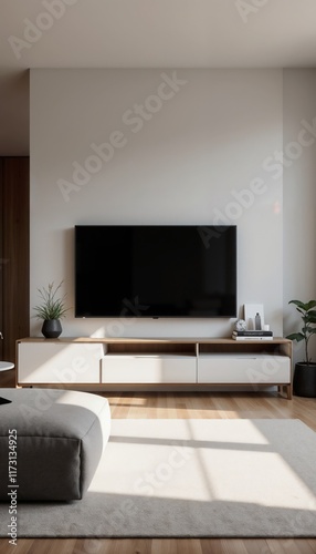 Minimalist modern living room with a sleek TV setup, wooden console, and bright decor in a serene and functional interior design.Minimalist Living Room with TV and Light Wooden Console