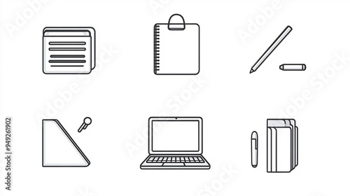 Minimalist Office Icons Icons representing typical office supplies paperclip notebook pen laptop folder Designed with simplicity in mind using only essential details to represent each object