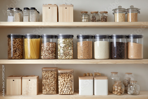 pantry, shelf, container, storage, bulk, food, glasses, jar, grain, bean, spice, minimalist, organisation, kitchen, eco, friendly, sustainable, neat, clean, interior, orderly, lifestyle, home, healthy, arrangement, modern, recyclable, label, refill, stacked, harmony, wood, simplicity, natural, design, neutral, aesthetic, calm, organic, tidy, display, layout, space, ai, generative