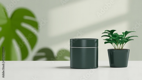 minimalist, product, display, container, jar, pot, green, plant, leaf, nature, tabletop, white, background, sunlight, shadow, eco, friendly, sustainable, home, decor, interior, design, modern, clean, simple, cosmetic, skincare, beauty, wellness, still, life, photo, elegant, natural, spa, zen