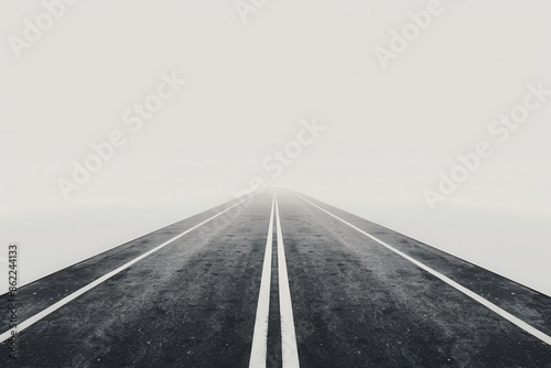 Minimalist road leading into foggy horizon, symbolizing journey, direction, and uncertainty in a monochrome, atmospheric setting.
