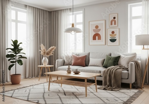 scandinavian, minimalist, living room, neutral, cosy, sofa, cushion, throw, blanket, hot drink, table, wood, accent, decor, design, interior, modern, nordic, style, bright, light, airy, simple, elegant, home, plant, vase, rug, geometric, pattern, wall, art, framed, natural, texture, inviting, comfortable, contemporary, stylish, aesthetic, daylight, peaceful, warm, relaxing, inspiration, arrangement