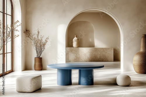minimalist, scandinavian, living room, interior, design, round table, blue, contemporary, cosy, furniture, decor, apartment, wall, window, floor, wood, wooden, light, armchair, dining, dining room, plant, concrete, stucco, stylish, indoor, house, door, doorway, flat, grey, lounge, room, modern, nobody, arch, in plaster, space, atmosphere, aesthetic, comfort, elegance, simplicity, visual