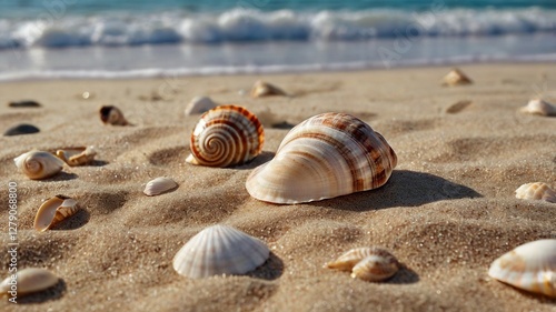 Minimalist Seashell Collection on Golden Sandy Beach near Turquoise Ocean Waves on Sunny Day