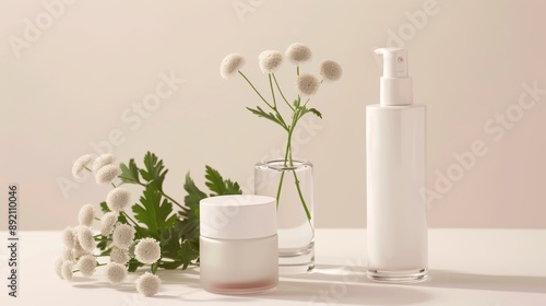 skincare, beauty, cosmetic, lotion, cream, moisturiser, flower, minimalism, elegance, nature, natural, wellness, luxury, purity, fresh, clean, aesthetic, spa, herbal, organic, simplicity, floral, pampering, health, white, delicate, design, bottle, jar, foliage, leaf, calmness, soothing, serene, peaceful, modern, botanical, plant, beauty product, still life