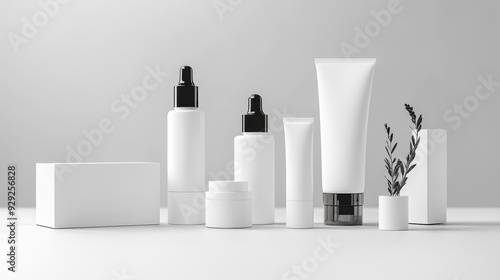 Minimalist skincare products with sleek, white packaging displayed on a clean, light gray background. The products are neatly arranged in a row, with subtle reflections adding sophistication.