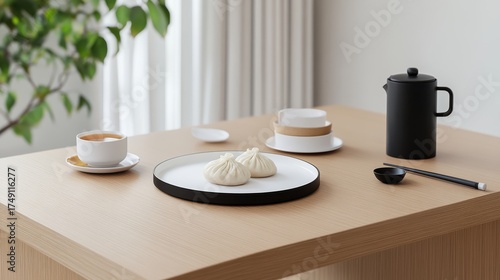 Minimalist Still Life: Steamed Dumplings on a Plate with Tea Set, Modern Asian Cuisine, Clean Aesthetic, Culinary Photography