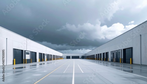 Minimalist Storage Facility Under Stormy Skies with Barcode Scanners