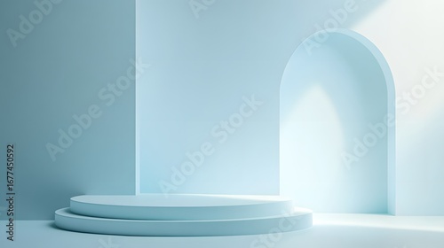 Minimalist Studio Background with Arch and Podium in Soft Blue